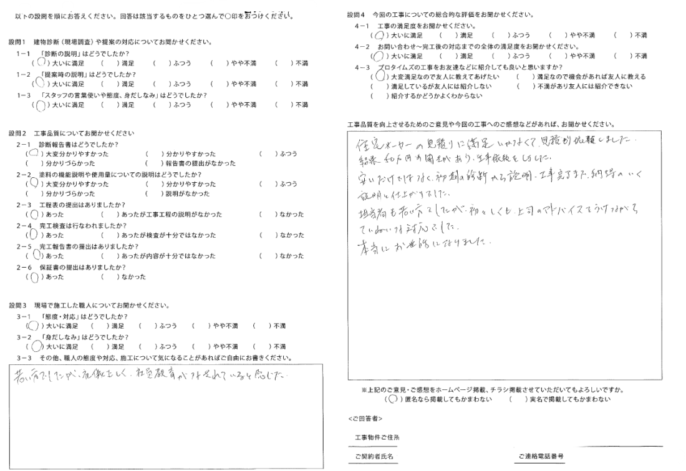 安いだけではなく、初期の診断から説明・工事完了まで納得のいく説明と仕上がりでした。